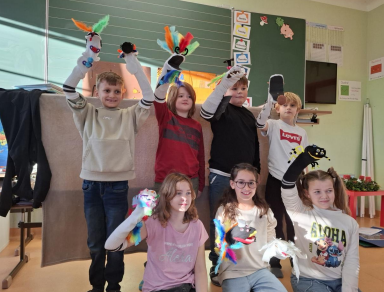 Die Kinder der 4. Klasse haben gemeinsam mit dem Lehrer einen Text für ihr Halloween-Theater geschrieben. Danach hat jedes Kind aus einer Socke, Karton und jede Menge Bastelmaterialien eine lustige Sockenpuppe mit Klappmaul gebaut. Natürlich individuell auf die im Stück vorkommenden Rollen angepasst. Es wurden auch Hintergründe (die späteren Leinwände) gestaltet und ein Lied einstudiert.